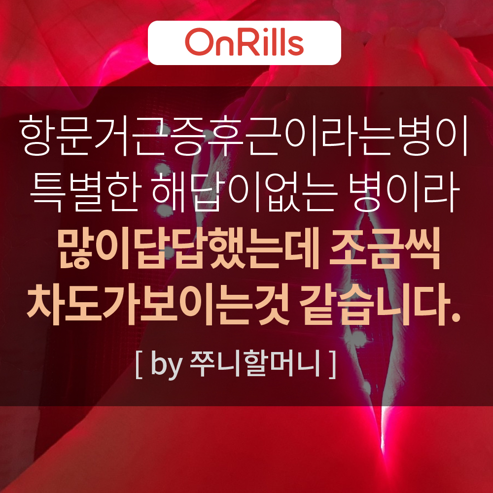 제가 지금 힘들어하는 항문거근증후근이라는병이 특별한 해답이없는 병이라 많이답답했는데 조금씩차도가보이는것 같습니다.