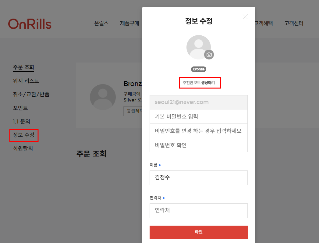<마이 페이지>에서 <정보 수정> 를 클릭하시면 추천인 코드를 생성할 수 있습니다. *해당 코드를 지인들에게 공유해주세요.