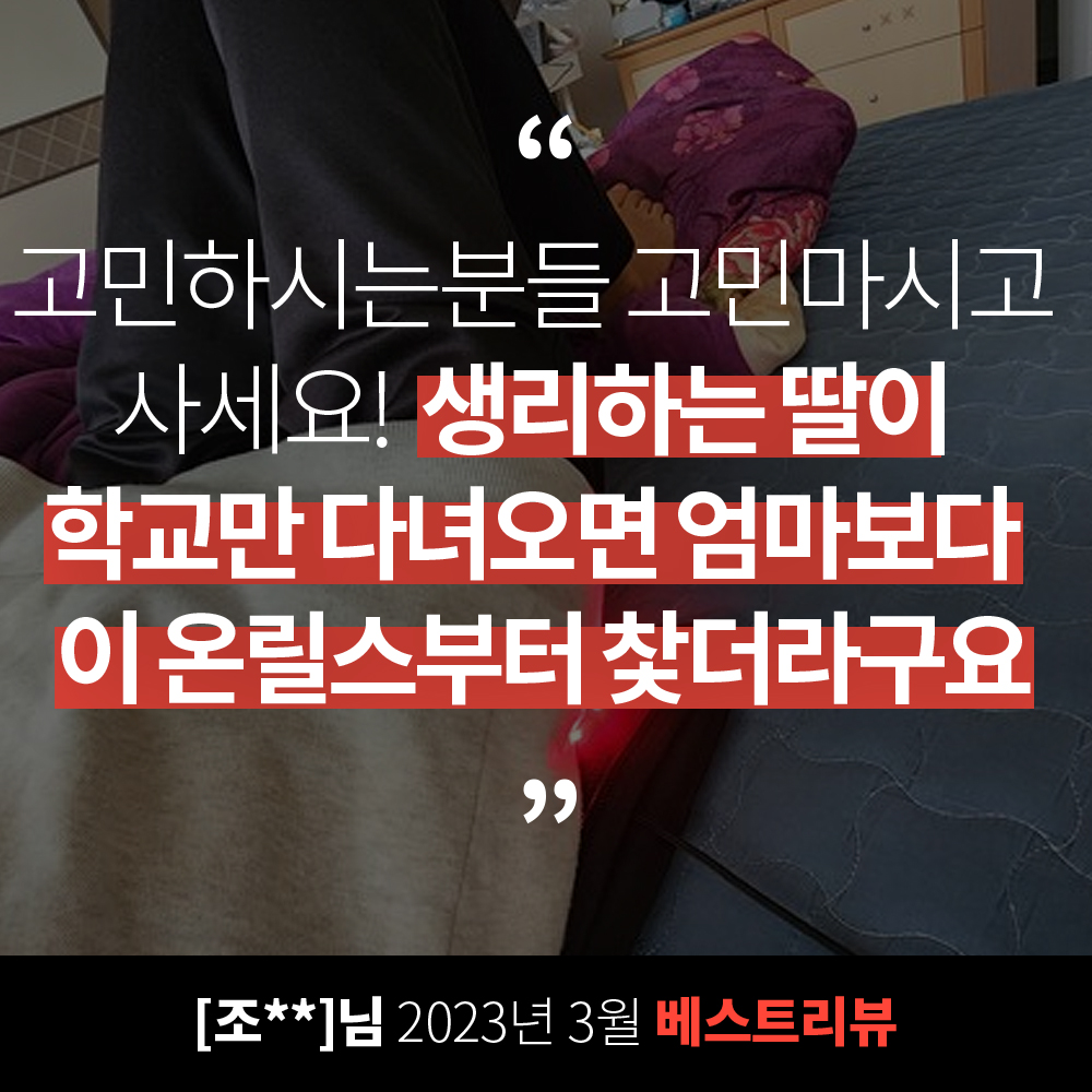 3일전 생리하는 딸아이가 한번 데보고는 좋았는지 학교만 다녀오면 엄마보다 이 온릴스부터 찿더라구요 이글을 쓰는 지금도 가슴에 안고 있는데 이 따뜻함은 몸을 기분좋게 릴렉스 시켜주는듯 해서 아로마 맛사지 받을때 기분과 같은 느낌입니다