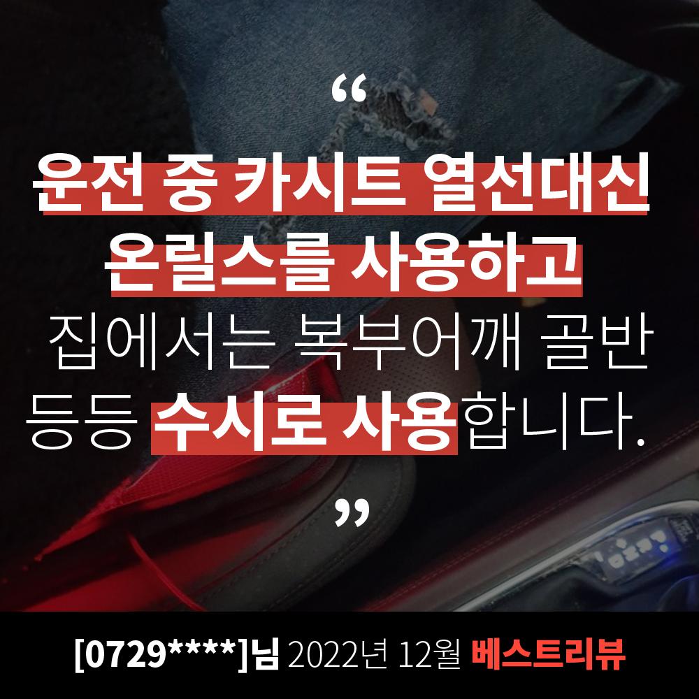 20일 사용해본 결과 저에겐 온릴스 좌욕기가 상당히 도움이 되고 있습니다. 운전 중 카시트 열선대신 온릴스 근적외선 좌욕기를 사용하고 집에서는 복부 어깨 골반등등 수시로 사용합니다. 특히 잠을 잘 때 타이머로 시간을 맞춰 놓고 사용하면 일부러 시간을 내서 사용하는 번거로움도 덜 수 있어 좋습니다. 처음에 이걸 사는걸 탐탁해하지 않던 찜질팩 숭배자 집사람도 찜질팩 대신 온릴스 좌욕기를 이젠 자주 사용합니다. 처음 사용할 땐 모드3으로 사용했는데 10일정도 사용하니까 몸의 체온이 상승해졌는지 뜨겁게 느껴져 주로 2모드로 사용하고 있습니다. 겨울이면 시렵던 발도 작년보다 덜 시렵고 어깨에 대줘도 뱃속이 꼬르록하고 소리내며 긴장된 장도 풀리네요. 아직 드라마틱한 커다란 변화는 없지만 소소한 작은 변화들이 나타나고 이젠 떨어질 수 없는 애정탬이 되버렸네요. 그리고 사용 중 컨트롤러 선이 빠져서 고객센터에 전화를 했을 때 신속하게 새 콘트롤러 보내 주셔서 잘 사용하고 있습니다. 이정도면 AS도 걱정 안하셔도 될 듯합니다. 신속한 AS에 감사드립니다.