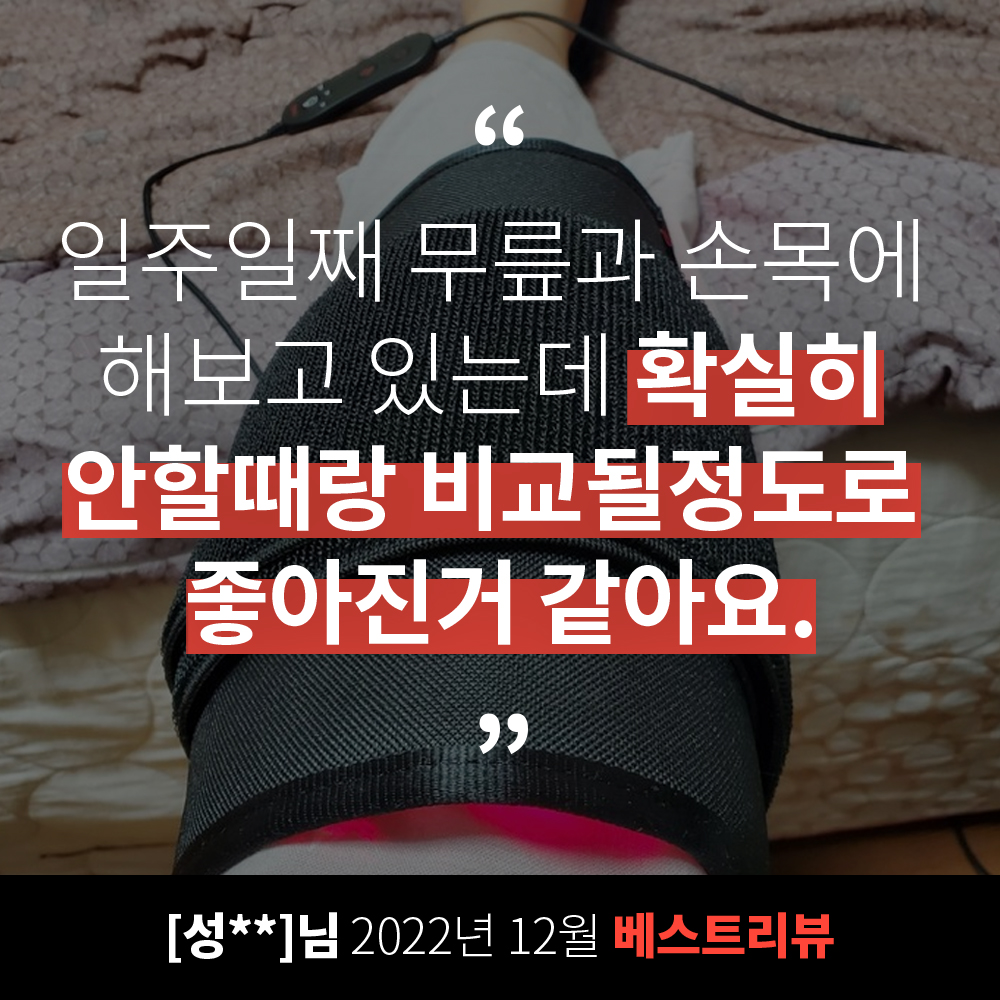 일단 일주일째 무릎과 손목에 해보고 있는데 확실히 안할때랑 비교될정도로 좋아진거 같아요.^^ 근적외선은 하루해서 좋아진다기보다 꾸준히 하는게 중요할꺼 같아서 열심히 열심히 하고 있습니다. 벨크로가 있어서 여기저기 부위에 할수 있는게 너무 좋네요. 사이즈도 적당해서 여행갈때나 직장에서 휴식할때도 사용할 수 있을꺼 같아요.